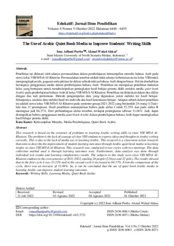 Purba, Isna Adhani and Ahkas, Akmal Walad (2022) The Use of Arabic Quiet Book Media to Improve Students’ Writing Skills. Edukatif: Jurnal Ilmu Pendidikan, 4 (5). pp. 6448-6455. ISSN 2656-8063
