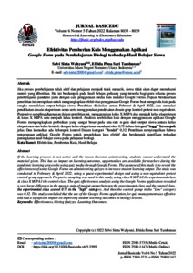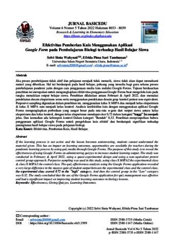 Jika proses pembelajaran tidak aktif dan pelajaran menjadi tidak menarik, siswa tidak akan dapat memahami materi yang diberikan. Hal ini berdampak pada hasil belajar, peluang yang tersedia bagi guru selama proses pembelajaran pandemi yaitu dengan cara penggunaan media kuis melalui Google Forms. Tujuan berdasarkan penelitian ini merupakan untuk mengungkapkan efektivitas penggunaan Google Forms buat mengelola kuis pada rangka menaikkan output belajar siswa. Penelitian dilakukan antara Februari & April 2022, dan memakai pendekatan desain eksperimen semu serta menggunakan pendekatan desain grup kontrol pretest non-equivalent. Purposive sampling digunakan dalam penelitian ini, menggunakan kelas X MIPA dua menjadi kelas eksperimen & kelas X MIPA satu menjadi kelas kontrol. Analisis keefektifan kuis dengan menggunakan aplikasi Google Forms mengungkapkan perbedaan yang sangat besar pada rata-rata n-gain dari output siswa antara kelas eksperimen dan kelas kontrol, dengan kelas eksperimen mendapat skor 0,72 dalam kategori “tinggi” Ini menjadi jelas. Dan kemudian ada kelompok kontrol Dalam kategori "Rendah" 0,32. Penelitian menyimpulkan bahwa penggunaan aplikasi Google Forms untuk pengelolaan kuis efektif dan berdampak signifikan terhadap peningkatan hasil belajar siswa pada pelajaran biologi.