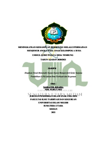 Khaira, Naidatol (2021) Meningkatkan Kemampuan Berhitung Melalui Permainan Menjemur Angka pada Anak Kelompok A di RA Ummul Quro Wijaya Desa Tembung Tahun Ajaran2020/2021. Skripsi thesis, Universitas Islam Negeri Sumatera Utara.