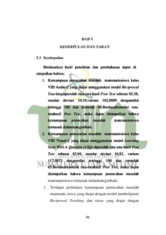 Penelitian ini adalah penelitian kuantitatif, dengan jenis penelitian eksperimen semu. Populasi adalah semua kelas VIII. Sampel diambil dengan teknik penarikan sampel random dan didapat 2 kelas yakni kelas VIII Audio-2 yang diajar dengan Reciprocal Teaching dan kelas VIII Visual-2 yang diajar dengan Learning Start With A Question (LSQ). Analisis data menggunakan uji t dan telah terpenuih prasyarat sampel berasal dari populasi berdistribusi normal dan homogen. Dari hasil tes akhir menunjukan bahwa terdapat perbedaan yang signifikan kemampuan pemecahan masalah Matematis Siswa yang diajar dengan model Reciprocal Teaching dan kelas VIII Visual-2 yang diajar dengan model Learning Start With A Question (LSQ). Nilai rata-rata kemampuan pemecahan masalah matematika siswa yang diajar dengan model Reciprocal Teaching diperoleh tes akhir 85,382, sedangkan rata-rata kemampuan pemecahan masalah matematika siswa yang diajar denganmodel Learning Start With A Question (LSQ) diperoleh tes akhir83,941. Kemampuan pemecahan masalah matematika siswa yang diajar dengan model Reciprocal Teachinglebih baik dari pada kemampuan pemecahan masalah matematika siswa yang diajar dengan model Learning Start With A Question (LSQ).