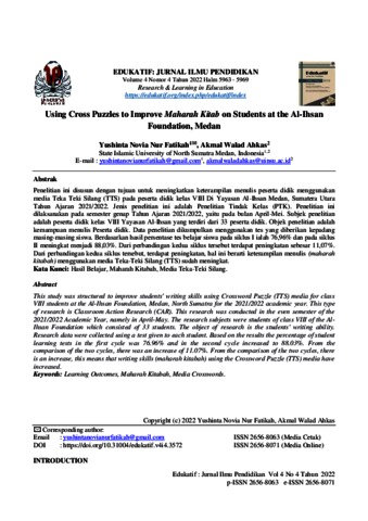 Fatikah, Yushinta Novia Nur and Ahkas, Akmal Walad (2022) Using Cross Puzzles to Improve Maharah Kitab on Students at the Al-Ihsan Foundation, Medan. Edukatif: Jurnal Ilmu Pendidikan, 4 (4). pp. 5963-5969. ISSN 2656-8063