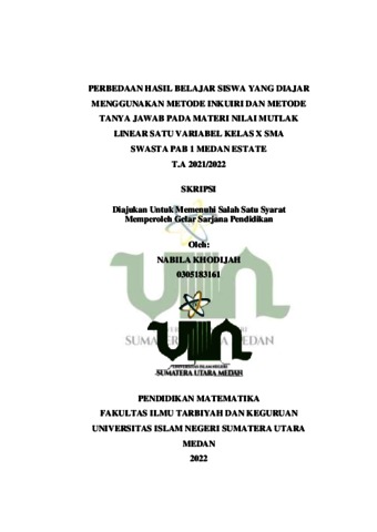 Khodijah, Nabila (2022) Perbedaan Hasil Belajar Siswa Yang Diajar Menggunakan Metode Inkuiri dan Metode Tanya Jawab Pada Materi Nilai Mutlak Linear Satu Variabel Kelas X SMA Swasta PAB 1 Medan Estate T.A 2021/2022. Skripsi thesis, Universitas Islam Negeri Sumatera Utara.