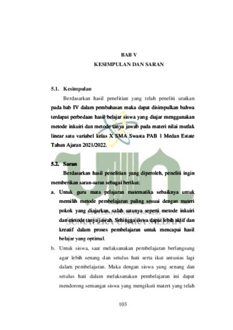 Yang dilatarbelakangi oleh hasil belajar siswa pada mata pelajaran matematika yang tidak tuntas atau tidak mencapai KKM dan kegiatan pembelajaran yang berlangsung dikelas terlihat monoton. Metodologi penelitian ini menggunakan pendekatan kuantitatif dengan jenis penelitian Quasi Eksperimen. Populasi penelitian adalah seluruh siswa kelas X SMA Swasta PAB 1 Medan Estate dengan jumlah sampel 25 kelompok kontrol atau yang diajar menggunakan metode inkuiri dan 25 kelompok eksperimen atau yang diajar menggunakan metode tanya jawab. Teknik pengambilan sampel dilakukan dengan menggunakan Sample Random Sampling. Teknik pengumpulan data dengan lembar observasi, wawancara, tes, dan dokumentasi. Hasil penelitian mengungkapkan bahwa (1) Hasil belajar siswa yang diajar menggunakan metode inkuiri termasuk dalam kategori baik, memperoleh nilai rata-rata sebesar 80,4. (2) Hasil belajar siswa yang diajar menggunakan dengan metode tanya jawab termasuk dalam kategori baik, memperoleh nilai rata-rata sebesar 75,6. (3) Terdapat perbedaan hasil belajar siswa yang diajar menggunakan metode inkuiri dan metode tanya jawab pada materi nilai mutlak linear satu variabel kelas X SMA Swasta PAB 1 Medan Estate dengan berdasarkan perhitungan uji t menunjukkan dan sedangkan nilai untuk taraf signifikan α = 0,05. Karena nilai , maka nilai Ha diterima dan Ho ditolak. Berdasarkan pada temuan penelitian di atas maka metode pembelajaran yang berpusat pada siswa, layak untuk diterapkan oleh guru selama proses pembelajaran sebagai salah satu solusi untuk meningkatkan hasil belajar siswa pada mata pelajaran matematika khususnya materi nilai mutlak linear satu variabel.