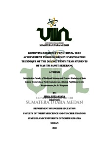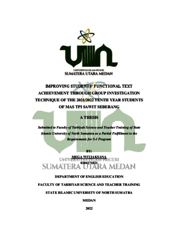 Witjaksana, Mega (2022) Improving Students’ Functional Text Achievement Through Group Investigation Technique of the 2021/2022 Tenth Year Students of MAS TPI Sawit Seberang. Skripsi thesis, Universitas Islam Negeri Sumatera Utara.