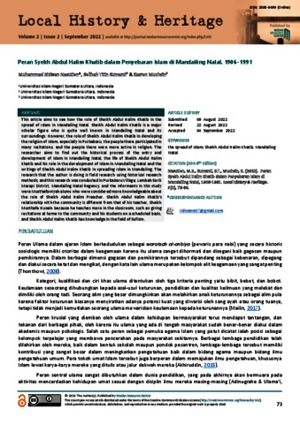 Nasution, Muhammad Ridwan and Sumanti, Solihah Titin and Muchsin, Kasron (2022) Peran Syekh Abdul Halim Khatib dalam Penyebaran Islam di Mandailing Natal, 1906-1991. Local History & Heritage, 2 (2). ISSN 2808-9499