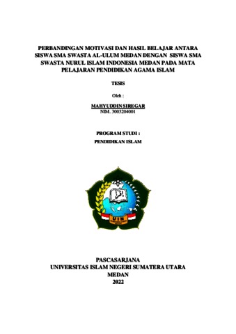 Siregar, Mahyuddin (2022) Perbandingan Motivasi Belajar dan Hasil Belajar Antara Siswa SMA Swasta Al-Ulum Medan dengan Siswa SMA Swasta Nurul Islam Indonesia Medan Pada Mata Pelajaran Pendidikan Agama Islam. Masters thesis, Pascasarjana Universitas Islam Negeri Sumatera Utara.