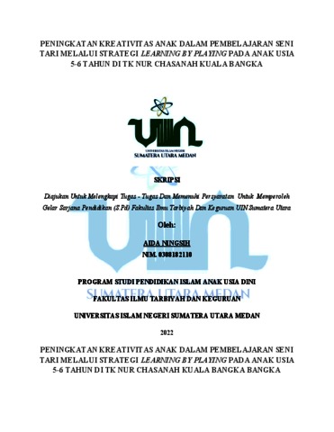 Ningsih, Aida (2022) Peningkatan Kreativitas Anak Dalam Pembelajaran Seni Tari Melalui Strategi Learning by Playing Pada Anak Usia Dini 5-6 Tahun di TK Nur Chasanah Kuala Bangka. Skripsi thesis, Universitas Islam Negeri Sumatera Utara.