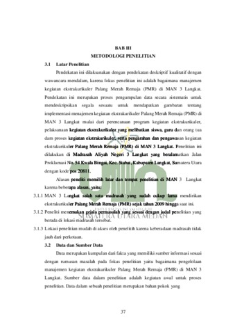 Kunci : Manajemen, Ekstrakurikuler dan Palang Merah Remaja (PMR) Penelitian yang telah dilakukan berjudul “Implementasi Manajemen Kegiatan Ekstrakurikuler Palang Merah Remaja (PMR) di MAN 3 Langkat". dengan latar belakang kegiatan non akademik, penelitian ini bertujuan untuk mengetahui penerapan manajemen kegiatan ekstrakurikuler Palang Merah Remaja (PMR) MAN 3 Langkat. Metodologi penelitian menggunakan penelitian kualitatif dengan mengumpulkan data melaui observasi, wawancara, dan dokumentasi serta teknik analisis data dengan menggunakan model Miles dan Huberman dengan langkah- langkah yaitu : reduksi data, penyajian data dan menarik kesimpulan. Berdasarkan hasil penelitian terkait rumusan masalah bahwa perencanaan kegiatan PMR Langkat dibuat oleh salah satu anggota PMR yang kemudian meminta kritik dan saran untuk melaksanakan kegiatan, dalam proses pelaksanaan kegiatan seluruh anggota berkumpul untuk membahas prosedur jalannya kegiatan dan membagi tugas penanggungjawab panitia dan dalam proses pelaksanaan kegiatan elstrakurikuler tidak melaksanakan evaluasi secara menyeluruh, namun diberi kritik dan saran dari pembina atau kakak alumni. Adapun faktor penghambat dan pendukung dalam kegiatan ekstrakurikuler PMR MAN 3 Langkat yaitu sarana dan prasarana, pelatih, dan anggota yang tidak bersungguh-sungguh.