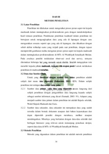 Penelitian yang telah dilakukan berjudul “Peran Supervisi Kepala Madrasah dalam Meningkatkan Profesionalisme Guru di MTs Al Washliyah Ismailiyah Medan yang dilatarbelakangi bahwa supervisi kepala madrasah berkewajiban melakukan pengkoordinasian seluruh kegiatan madrasah dengan menghubungkan seluruh pegawai yang ada didalamnya guna meningkatkan proesionalisme guru, keselarasan dan kerjasama. Dalam penelitian ini bertujuan mendeskripsikan peran supervisi kepala madrasah dalam meningkatkan profesionalisme guru di MTs Al Washliyah Ismailiyah Medan. Penelitian ini menggunakan jenis penelitian kualitatif. Sumber informasi penelitian ini adalah kepala Madrasah, Wakil Kepala Madrasah bidang kurikulum dan kesiswaan, dan para guru maupun pegawai di MTs Al Washliyah Ismailiyah Medan. Teknik pengumpulan data dilakukan melalui wawancara mendalam, observasi, dan dokumentasi. Teknik analisis data dilakukan dengan cara mereduksi data, penyajian data dan penarikan kesimpulan atau verifikasi. Teknik penjamin keabsahan data dengan cara triangulasi data, transferabilitas dan konfirmabilitas. Hasil penelitian ini yaitu 1) Bahwa peran supervisi kepala madrasah dalam menyusun perangkat pembelajaran di MTs Al Washliyah Ismailiyah Medan melibatkan seluruh pihak dalam organisasi dengan musyawarah.Selain itu juga kepala madrasah juga melakukan rapat dengan para guru untuk diberi masukan atas kekurangan dan kelebihan dalam mengajar. 2) bahwa peran supervisi dalam penguasaan materi guru di MTs Al Washliyah Ismailiyah Medan sudah sesuai dengan kemampuan profesional guru dalam penguasaan materi. Tapi masih ada juga beberapa guru yang kurang mumpuni di bidangnya masing-masing. 3) bahwa peran supervisi kepala madrasah dalam metode pembelajaran guru di MTs Al Washliyah Ismailiyah Medan walaupun latar belakang pendidikan guru berbeda-beda, tetapi guru disini berupaya untuk meningkatkan peneguasaan metode pembelajaran mereka sendiri. Selain itu juga kepla madrasah tetapi ikut andil dalam meningkatkan penguasaan metode pembelajaran guru di madrasah itu. 4) Faktor pendukung dan penghambat dalam meningkatkan profesionalisme guru di MTs Al Washliyah Ismailiyah Medan yang menjadi faktor dukungan utama adalah dengan adanya kerjasama baik kepala madrasah dengan guru, dan guru dengan guru. Baik dalam usaha formal maupun usaha non-formal.