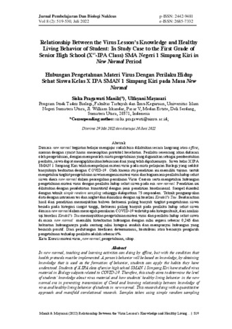 Manik, Siska Pragawati and Mayasari, Ulfayani (2022) Hubungan Pengetahuan Materi Virus Dengan Perilaku Hidup Sehat Siswa Kelas X IPA SMAN 1 Simpang Kiri pada Masa New Normal. Jurnal Pembelajaran Dan Biologi Nukleus, 8 (2). pp. 519-530. ISSN p-ISSN: 2442-9481 e-ISSN: 2685-7332