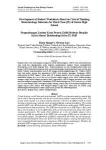Berpikir kritis yaitu keterampilan yang perlu untuk dikembangkan. LKPD yaitu alternatif bahan Ajar yang bisa dipergunakan pada kegiatan pembelajaran dengan tujuan meningkatkan keterampilan siswa dalam berpikir kritis. Tujuan penelitian ini yaitu mengahasilkan bahan ajar berupa LKPD berorientasi berpikir kritis materi bioteknologi yang dinyatakan layak, praktis dan efektif. Metode yang diterapkan yaitu R&D dengan model pengembangan 4D. Validasi LKPD oleh ahli media, materi dan kepraktisan LKPD oleh praktisi lapangan. Pengujian LKPD dilaksanakan di SMP Negeri 1 Barus kelas XI A dengan jumlah siswa 34 orang, untuk melihat keefektifan dengan test pre-test dan post-test beserta angket respon siswa. Hasil validasi dengan kategori sangat layak dengan persentase 84%, kepraktisan LKPD dengan persentase 94% yang termasuk kategori sangat praktis. Keefektifan LKPD diukur dengan uji N-Gain rata-rata pre-test dan post-test siswa dengan skor 0,6 dengan kategori sedang, artinya nilai siswa terjadi peningkatan dan angket respon siswa sebesar 82% dengan kategori sangat baik. Maka dari itu LKPD yang dikembangkan dikategorikan sudah sangat layak, praktis dan efektif digunakan.