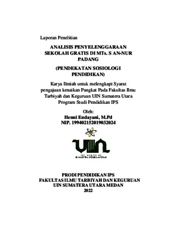 Endayani, Henni (2022) Analisis Penyelenggaraan Sekolah Gratis di MTs.S An-Nur Padang (Pendekatan Sosiologi Pendidikan). Prodi Tadris IPS Fakultas Keguruan dan Ilmu Pendidikan UIN Sumatera Utara, Medan. (Submitted)