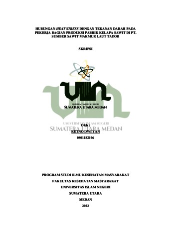 Retno Dwi Yan, Retno Dwi Yan (2022) Hubungan Heat Stress Dengan Tekanan Darah Pada Pekerja Bagian Produksi Pabrik Kelapa Sawit Di PT. Sumber Sawit Makmur Laut Tador. Skripsi thesis, Universitas Islam Negeri Sumatera Utara.