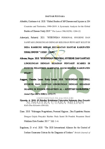 Zega, Rahmad Siddiq (2022) Hubungan Personal Hygiene dan Sanitasi Lingkungan Dengan Kejadian Scabies di Pondok Pesantren Darul Arafah Raya Kutalimbaru. Skripsi thesis, Universitas Islam Negeri Sumatera Utara.
