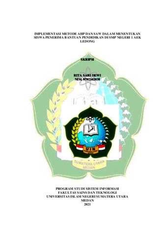 Dewi, Rita Sari (2021) Implementasi Metode Analitycal Hierarchy Process dan Simple Additive Weighting Dalam Menentukan Siswa Penerima Bantuan Pendidikan di SMP Negeri 1 Aek Ledong. Skripsi thesis, Universitas Islam Negeri Sumatera Utara.