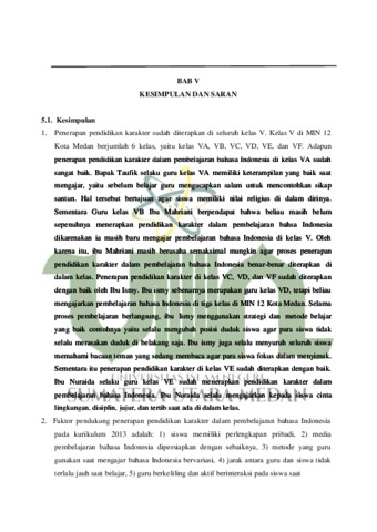 Penelitian yang telah dilakukan berjudul “Penerapan Pendidikan Karakter Dalam Pembelajaran Bahasa Indonesia Pada Kurikulum 2013 Di MIN 12 Kota Medan”, yang dilatar belakangi bahwa guru-guru kelas V mengalami kesulitan dalam mengajarkan pembelajaran bahasa Indonesia terutama dalam penerapan pendidikan karakter karena perubahan mata pelajaran yang guru kelas ampu. Penelitian ini bertujuan untuk mendeskripsikan penerapan pendidikan karakter, faktor pendukung dan penghambat serta upaya dalam penerapan pendidikan karakter. Metode penelitian menggunakan metode deskriptif kualitatif untuk menganalisis pengaruh pendidikan karakter dalam pembelajaran bahasa Indonesia. Hasil penelitian mengungkapkan bahwa (1) penerapan pendidikan karakter di seluruh kelas V juga sudah diterapkan dengan sebaiknya, walau ada beberapa guru yang merasa masih belum menerapkan pendidikan karakter sepenuhnya di dalam pembelajaran termasuk bahasa Indonesia, (2) faktor pendukung penerapan pendidikan karakter pada pembelajaran bahasa Indonesia meliputi: Siswa memiliki perlengkapan sekolah pribadi, media pembelajaran bahasa Indonesia dipersiapkan dengan baik, metode belajar yang bervariasi, jarak duduk antara guru dan siswa tidak terlalu jauh saat belajar, guru berkeliling dan aktif berinteraksi pada siswa, motivasi siswa, pengaturan jadwal pembelajaran, kemampuan guru dalam mengaitkan materi dengan pendidikan karakter, dan kemampuan siswa dalam menyerap materi yang dikaitkan guru. faktor penghambat penerapan pendidikan karakter meliputi: Kesulitan siswa dalam mengikuti pembelajaran bahasa Indonesia, sarana dan prasarana sekolah yang tidak lengkap, pengaruh lingkungan sosial sekolah, (3) upaya dalam menggiatkan kembali nilai-nilai pendidikan karakter meliputi: melakukan pembelajaran dan kegiatan positif diluar kelas, melengkapi sarana dan prasaran sekolah, berkarakter yang baik kepada para siswa.