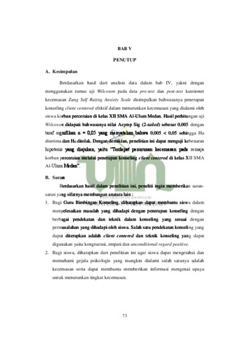 Penelitian yang berjudul, “Penerapan Konseling Client Centered Untuk Menurunkan Kecemasan Pada Remaja Korban Perceraian Di Kelas XII SMA Al-Ulum Medan”, dilaksanakan sebagai upaya dalam membantu siswa menurunkan kecemasan akibat perceraian orang tua melalui penerapan konseling individu dengan pendekatan client centered. Jenis penelitian yang digunakan adalah jenis penelitian kuantitatif. Dalam penelitian ini, peneliti menggunakan penelitian eksperimen dengan menggunakan desain pretes-postes satu kelompok (one group pre-test post-test design). Populasi penelitian adalah siswa kelas XII SMA Al-Ulum Medan yang berjumlah 211 siswa dengan sampel berjumlah 10 siswa. Teknik pengambilan sampel menggunakan purposive sampling. Teknik pengumpulan data yang digunakan adalah kuesioner Zung Self Rating Anxiety Scale. Alat pengolah data yang digunakan yaitu aplikasi IBM SPSS Statistic 21 dengan teknik analisis data menggunakan rumus Uji Wilcoxon. Hasil penelitian ini menunjukkan bahwa kecemasan siswa korban perceraian sebelum diberikan konseling client centered berada pada kategori kecemasan ringan dengan rentan skor 45-59, dan setelah diberikan konseling client centered yang bertujuan untuk menurunkan kecemasan siswa korban perceraian mengalami penurunan ke kategori normal dengan rentan skor 20-44. Dari hasil penurunan kategori kecemasan dapat dikatakan bahwa terjadi penurunan pada hasil pre-test dan post-test. Maka dapat disimpulkan bahwa melalui konseling client centered efektif untuk menurunkan tingkat kecemasan remaja korban perceraian yang dapat dilihat dari hasil analisis data bahwa nilai p value Asymp Sig (2-tailed) sebesar 0,005 < 0,05 maka H0 ditolak.