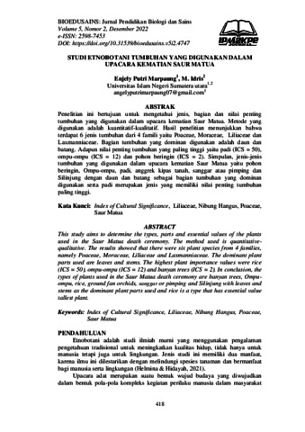 Marpaung, Enjely Putri and Idris, M. (2022) Studi Etnobotani Tumbuhan Yang Digunakan Dalam Upacara Kematian Saur Matua. BIOEDUSAINS: Jurnal Pendidikan Biologi dan Sains, 5 (2). pp. 418-424. ISSN 2598-7453