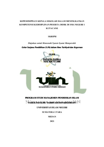 Fadila, Dayana (2021) Kepemimpinan Kepala Sekolah Dalam Meningkatkan Kompetensi Kedisiplinan Peserta Didik Di Sma Negeri 1 Kutacane. Skripsi thesis, Universitas Islam Negeri Sumatera Utara.