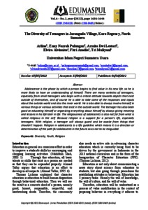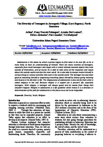 Arlina, Arlina and Pulungan, Enny Nazrah and Lestari, Armita Dwi and Alvionita, Elvira and Amelia, Fitri and Muliyani, Tri (2022) The Diversity of Teenagers in Jaranguda Village, Karo Regency, North Sumatera. Edumaspul: Jurnal Pendidikan, 6 (2). pp. 1636-1644. ISSN 2580-0469