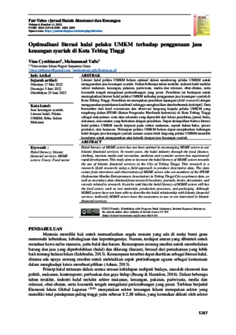 Cynthiasari, Vina and Yafiz, Muhammad (2022) Optimalisasi literasi halal pelaku UMKM terhadap penggunaan jasa keuangan syariah di Kota Tebing Tinggi. Fair Value : Jurnal Ilmiah Akuntansi dan Keuangan, 4 (11). ISSN P-ISSN: 2622-2191 E-ISSN : 2622-2205