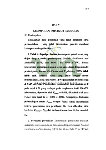 Penelitian ini bertujuan untuk mengetahui perbedaan kemampuan spasial dan kemampuan pemecahan masalah matematis siswa yang diajar dengan model pembelajaran Student Facilitator and Explaining (SFE) dan Think Talk Write (TTW) pada materi Dimensi Tiga kelas XII SMA Al-Azhar Plus Medan. Penelitian ini adalah penelitian kuantitatif, dengan jenis penelitian eksperimen. Populasinya seluruh siswa kelas XII yang berjumlah 150 siswa, sedangkan sampelnya 30 siswa kelas ekperimen A dan 30 siswa kelas eksperimen B. Instrumen tes yang digunakan adalah tes kemampuan spasial dan tes kemampuan pemecahan masalah matematis siswa, masing- masing terdiri dari 5 soal yang berbentuk uraian soal. Dalam penelitian ini hasil uji Fhitung untuk hipotesis pertama diperoleh harga Fhitung = 0.418 dan Ftabel = 4.007 berarti Fhitung < Ftabel maka H0 diterima. Hipotesis kedua diperoleh harga Fhitung = 5.271 dan Ftabel = 4.007 berarti Fhitung > Ftabel maka Ha diterima. Pada hipotesis ketiga diperoleh harga Fhitung = 5.175 dan Ftabel = 3.923 berarti Fhitung > Ftabel maka H0 diterima. Hasil temuan ini menunjukkan: 1) Kemampuan Spasial yang diajar dengan model pembelajaran Student Facilitator and Explaining (SFE) tidak lebih baik daripada siswa yang diajar dengan model pembelajaran Think Talk Write (TTW) pada materi Dimensi Tiga. 2) Kemampuan pemecahan masalah matematis siswa yang diajar dengan model pembelajaran Student Facilitator and Explaining (SFE) lebih baik daripada siswa yang diajar dengan model pembelajaran Think Talk write (TTW) pada materi Dimensi Tiga. 3) Kemampuan spasial dan kemampuan pemecahan masalah matematis siswa yang diajar dengan model pembelajaran Student Facilitator and Explaining (SFE) lebih baik daripada siswa yang diajar dengan model pembelajaran Think Talk Write (TTW) pada materi Dimensi Tiga.