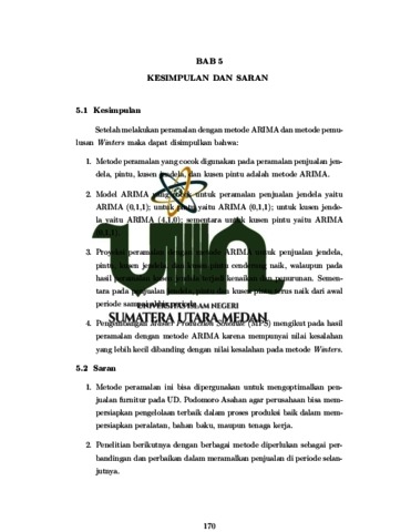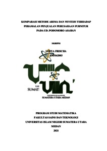 SeiringndengannpertumbuhannperekonomianndinIndonesia,,kebutuhaniakan perabotannrumahmtanggamjugammeningkat, termasuk furniture. Hal ini membuat perusahaan-perusahaan furnitur berlomba untuk menghasilkan produk sesuai dengan permintaan konsumen. Karena itu, perusahaannmelakukannperamalannpenjualannuntukimengetahui perkembanganmpenjualannya agar penjualannbisa optimum.Tujuan penelitian ini adalah untuk menyelesaikan problematika pada naik atau turunnya penjualan furniture jendela, pintu, kusen jendela, dan kusen pintu pada Juli 2021 sampai Juni 2022 sertanpembuatannjadwalnproduksinberdasarkannhasilnperamalannyang,didapat. Data penelitian ini adalah data penjualan jendela, pintu, kusen jendela, dan kusen pintu di UD. Podomoro Asahan dari Juli 2016 sampai Juli 2021. Datandiolahndengan menggunakan metodenARIMAndan Winters kemudian dibandingkanmantara kedua metode tersebut. Hasil penelitian dengannmetodemARIMA,mmodelmyang digunakannuntuk penjualan jendela adalahnARIMA (0,1,1)ndengannnilainkesalahancMPE -0,079772% dannMAPE 16,592778%. Untuknperamalannpenjualan pintu, modelnyang digunakan adalahnARIMA (0,1,1)ndenganmnilaimkesalahanmMPE -0,318423% danmMAPE 43,437804%. Untukmperamalan penjualan kusen jendela, modelmyang digunakan adalah ARIMA (4,1,0)mdenganmnilaimkesalahanmMPE -0,079175% danmMAPE 9,822958%. Dan untukmperamalan penjualan kusen pintu, modelmyang digunakan adalah ARIMA (0,1,1)mdenganmnilaimkesalahanmMPE -0,107229% danmMAPE 15,198182%. Hasil penelitian dengan metodemWinters,nkonstantanpemulusannyang digunakan untuknperamalan penjualannjendela adalahm=0,546225; =0,259846; =0,116178; dengannnilainkesalahannMPE -0,39785% danmMAPE 39,78471%. Untukmperamalan penjualan pintu, konstantampemulusanmyangndigunakan adalah =0,254329; =0,023969; =0,142605; dengannnilainkesalahannMPE -0,2562% dan ii MAPE 35,10514%. Untuknperamalan penjualan kusen jendela, konstantanpemulusan yangmdigunakanmadalah =0,450330; =0,282896; =0,110233; denganmnilai kesalahannMPE 0,140471% dannMAPE 14,85902%. Dan untukjperamalan penjualan kusen pintu, konstantanpemulusannyang digunakan adalah =0,527457; =0,377911; =0,193586; dengannnilainkesalahannMPE 0,071708% dannMAPE 16,47254%.