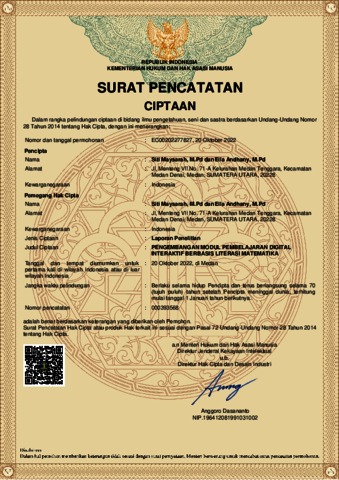 Maysarah, Siti and Andhany, Ella (2022) HAKI Pengembangan Modul Pembelajaran Digital Interaktif Berbasis Literasi Matematika. UIN Sumatera Utara Medan.