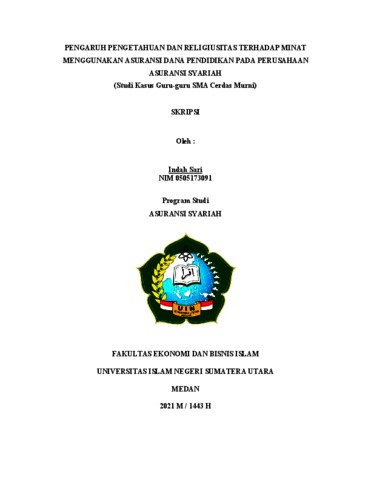 Indah Sari, Nim 0505173091. “PENGARUH PENGETAHUAN DAN RELIGIUSITAS TERHADAP MINAT MENGGUNAKAN ASURANSI DANA PENDIDIKAN PADA PERUSAHAAN ASURANSI SYARIAH”. Dibawah bimbingan Pembimbing Skripsi 1 oleh Ibu Nurbaiti, M.Kom dan Pembimbing Skripsi 2 oleh Ibu Nurul Inayah, M. E. Asuransi pendidikan merupakan jenis asuransi yang memberikan proteksi biaya pendidikan terhadap biaya pendidikan anak. Penelitian ini bertujuan untuk mengetahui pengaruh pengetahuan dan religiusitas terhadap minat menggunakan asuransi dana pendidikan pada perusahaan asuransi syariah pada guru-guru di salah satu SMA yang ada di Sumatera Utara baik secara parsial maupun secara simultan. Metode yang digunakan dalam penelitian ini adalah metode kuantitatif. Populasi penelitian ini dilakukan pada guru-guru di salah satu SMA yang ada di Sumatera Utara dengan sampel berjumlah 65 guru. Menggunakan data primer dengan penyebaran kuesioner dan metode analisis regresi berganda dengan menggunakan pengujian hipotesis. Hasil penelitian ini secara simultan dari variable pengetahuan dan religiusitas berpengaruh secara signifikan terhadap minat. Kemudian secara parsial variabbel pengetahuan juga berpengaruh terhadap minat serta variabel religiusitas sendiri juga berpengaruh secara signifikan terhadap minat menggunakan asuransi dana pendidikan pada perusahaan asuransi syariah.