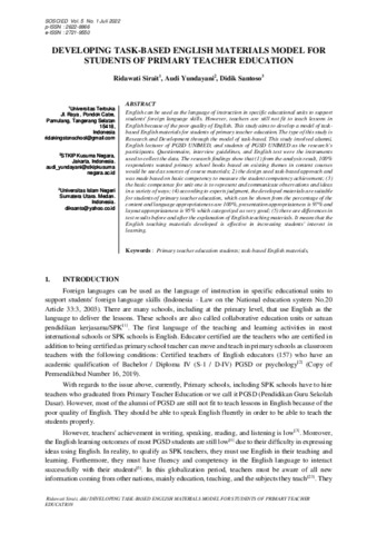 Sirait, Ridawati and Yundayani, Audi and Santoso, Didik (2022) Developing Task-Based English Materials Model For Students Of Primary Teacher Education. SOSCIED, 5 (1). ISSN 2721-9550