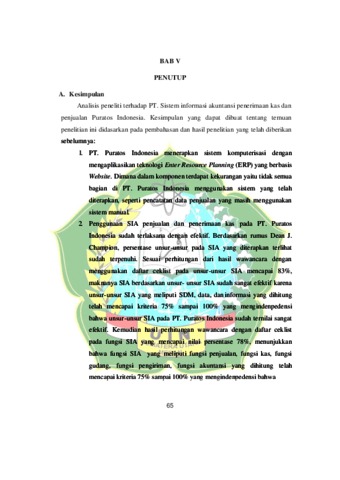enelitian ini dilakukan untuk mengetahui efektivitas sistem informasi akuntansi penjualan dan penerimaan kas pada PT. Puratos Indonesia. Sistem yang digunakan adalah dengan menerapkan Enterprise Resource Planning (ERP) berbasis Website Penelitian ini menggunakan pendekatan Mixed Method yang menggunakan dua metode yaitu kualitatif dan kuantitatif dengan teknik pengumpulan data berupa dokumentasi dan wawancara dengan pihak terkait. Metode analisis data yang digunakan adalah metode deskriptif, yaitu penyajian data, dan penarikan kesimpulan. Untuk menganalisis data penelitian ini menggunakan metode Dean J Champion dalam bentuk persentase. Dapat disimpulkan bahwa efektivitas sistem informasi akuntansi penjualan dan penerimaan kas pada PT. Puratos Indonesia telah diimplementasikan dengan cukup efektif, dapat dilihat dari penerapan sistem yang sudah menggunakan sistem komputerisasi. Dan dari perhitungan Dean J. Champion yang mengandung unsur sistem informasi akuntansi yang efektif dengan persentase 83%, dan sistem informasi akuntansi 78%, sedangkan komponen sistem informasi akuntansi cukup efektif dengan persentase 73% karena masih adanya sistem yang dilakukan secara manual dalam pencatatan penjualan.