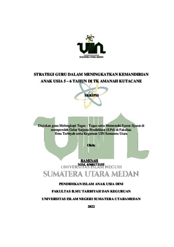 Raminah, Raminah (2022) Strategi Guru Dalam Meningkatkan Kemandirian Anak Usia 5 – 6 Tahun Di TK Amanah Kutacane. Skripsi thesis, Universitas Islam Negeri Sumatera Utara.