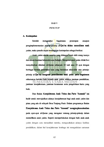 Anak yatim merupakan mereka yang ditinggal wafat oleh orang tuanya, baik itu ayah atau pun ibunya. Dalam pemeliharaannya kadang kala banyak yang tidak sesuai dengan prinsip-prinsip pemeliharaan anak yatim yang berdasarkan pada alQur’an dan Sunnah. Maka dari itu perlu adanya pemahaman terkait prinsip-prinsip dalam memelihara anak yatim, terkhusus bagi mereka yang mengembangkan lembaga-lembaga terkait pemeliharaan anak yatim, yang salah satunya adalah Badan Kesejahteraan Anak Yatim dan Piatu “Amanah” sebagai lembaga yang menaungi anak yatim dan paitu di Desa Tanjung Pasir, kec.Pangkalan Susu. Adapun tujuan penelitian ini adalah untuk mengetahui pengimplementasian prinsip-prinsip al-Qur’an dalam memelihara anak yatim yang diterapkan di Badan Kesejahteraan Anak Yatim dan Piatu “Amanah” sebagai lembaga yang menaungi anak yatim dan paitu di Desa Tanjung Pasir, kec.Pangkalan Susu. Metode yang digunakan dalam penelitian ini metode kualitatif deskriptif serta metode tafsir maudhu’I dengan jenis penelitian kepustakaan serta penelitian lapangan, dengan teknik pengumpulan data Dan hasil penelitian yang didapat dari lembaga ini iyalah bahwa lembaga ini menerapkan berlaku baik terhadap anak yatim, adanya pendidikan yang baik, jaminan keamanan dan jaminan kesejahteraan, serta pengelolaan harta anak-anak yang didapat dari masyarakat.