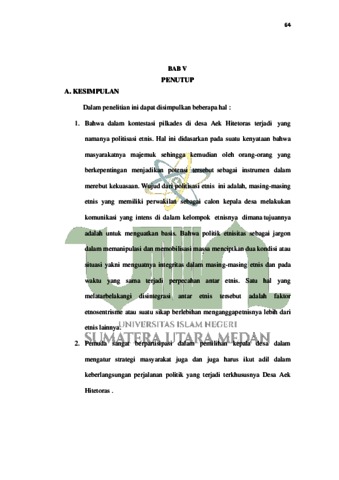 Peran suku dan peran pemuda dalam pemilihan kepala Desa di Desa Aek Hitetoras bahwa politik etnisitas memiliki pengaruh yang besar dalam setiap pilkades di desa Aek Hitetoras, dan mempunyai strategi kemenangan masingmasing calon kepala desa, yaitu tindakan manipulasi dan mobilisasi, dominasi sosial dan solidaritas politik. Fokus penelitian ini adalah peran suku dan pemuda dalam partisipasim pada pemilihan Kepala Desa tahun 2019. Adapun metode penelitian yang digunakan yaitu penelitian kualitatif yang bersifat deskriftif dengan jenis penelitian fenomenologis (Penulis turun langsung kelapangan melihat fenomena yang terjadi dilapangan). Hasil dari penelitian ini menunjukkan bahwa peran politik etnisitas di desa Aek Hitetoras acap kali dijadikan jargon oleh masing-masing kontestan sebagai basis mencapai kekuasaan atau jabatan kepala desa. Strategi ini dinilai sukses dengan melihat kondisi masyarakat desa Aek Hitetoras yang multi etnis kemudian dimanfaatkan sebagai basis dalam menjaring massa. Strategiyang metodologis dan sistem akhirnya kecenderungan masyarakat dalam memilih kepala desa adalah didasarkan pada kesamaan etnis dengan masing- masing calon kepala desa. Diharapkan kepada pihak masyarakat jangan menerima politik yang tidak mendidik, gunakan rasionalitas dalam menjatuhkan pilihan pada calon kepala desa. Pahami visi misi dan programnya bukan membiarkan apalagi memilih dengan mengedepankan kesamaan ideologis atau etnis serta diharapkan kepada panitia pengawas pemilu harus pro aktif terhadap politisasi etnis dalam materi kampanye masing-masing calon. Berikan aturan dan sanksi tegas terhadap calon-calon yang melanggar aturan dalam berkampanye.