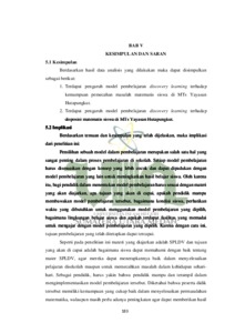Penelitian yang telah dilakukan berjudul “ Pengaruh Model Pembelajaran Discovery Learning Terhadap Kemampuan Pemecahan Masalah Matematis Dan Disposisi Matematis Siswa Di MTs Yayasan Hutapungkut” yang dilatarbelakangi bahwa rendahnya kemampuan pemecahan masalah matematis siswa dalam menyelesaikan soal yang diberikan, siswa masih kesulitan memahami maksud soal, mengidentifikasi unsur apa yang diketahui dan unsur yang ditanyakan, membuat model matematika, dan rencana penyelesaian siswa tidak terarah. Dan rendahnya disposisi matematis siswa dapat dilihat dari sikap siswa yang tidak percaya diri ketika diminta untuk mengemukakan pendapat dan menyelesaikan tugas yang diberikan saat dalam mengikuti proses pembelajaran terutama pembelajaran matematika. Tujuan penelitian untuk mengetahui pengaruh model pembelajarn discovery learning terhadap kemampuan pemecahan masalah matematis dan disposisi matematis siswa di MTs Yayasan Hutapungkut. Metode penelitian menggunakan quasi eksperimen (quasi eksprimental design). Populasi penelitian adalah siswa kelas VIII MTs Yayasan Hutapungkut dengan jumlah sampel 25 siswa kelompok eksperimen dan 25 siswa kelompok kontrol. Teknik penentuan sampel dilakukan dengan menggunakan cluster random sampling. Teknik pengumpulan data yaitu dengan menggunakan tes dan angket. Hasil penelitian mengungkapkan bahwa (1) model pembelajarn discovery learning memberikan pengaruh terhadap kemampuan pemecahan masalah matematis siswa (2) model pembelajaran discovery learning memberikan pengaruh terhadap disposisi matematis siswa.