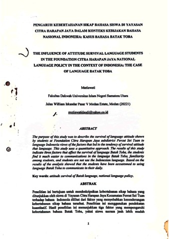 Mutiawati, Mutiawati Pengaruh Kebertahanan Sikap Bahasa Siswa Di Yayasan Citra Harapan Jaya Dalam Konteks Kebijakan Bahasa Nasional Indonesia: Kasus Bahasa Batak Toba. Fakultas Dakwah Dan Komunikasi UINSU Medan.