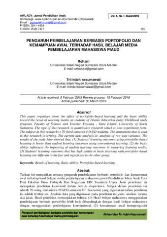 Rohani, Rohani and Kesumawati, Tri Indah (2019) Pengaruh Pembelajaran Berbasis Portofolio Dan Kemampuan Awal Terhadap Hasil Belajar Media Pembelajaran Mahasiswa PIAUD. Awlady: Jurnal Pendidikan Anak, 5 (1). ISSN 2541-4658 ; 2528-7427