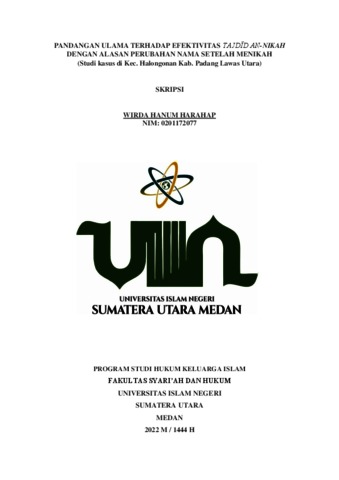 Harahap, Wirda Hanum (2022) Pandangan ulama terhadap efektivitas Tajdid An-Nikah dengan alasan perubahan nama setelah menikah (Studi kasus di Kec. Halongonan Kab. Padang Lawas Utara). Skripsi thesis, Universitas Islam Negeri Sumatera Utara.