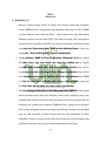 Pernikahan merupakan suatu hal yang sangat sakral yang dilakukan oleh sepasang kekasih yang terdiri dari seorang laki-laki dan seorang perempuan untuk membentuk suatu ikatan pernikahan yang berdasarkan pada ketentuan (rukun dan syarat nikah) agar membentuk keluarga yang kekal dan bahagia sepanjang hidup. Seiring dengan perubahan zaman yang semakin pesat sekarang ini fenomena atau kejadian-kejadian yang langka atau baru juga terjadi dalam hal pernikahan, sebagaimana yang terjadi kecamatan Holongonan Kabupaten Padang Lawas Utara yang mana di desa ini ada beberapa pasang pasangan yang sudah menikah melangsungkan pernikahan ulang yang biasa disebut dengan Tajdīd an-Nikah. Namun, Tajdīd an-Nikah dalam konteks ini bukan karena adanya rusak akad yang sebelumnya, atau karena terjadinya perceraian atau jatuhnya talak melainkan pernikahan ulang yang dilakukan ini karena alasan perubahan nama. Oleh karena itu menurut penulis ini adalah suatu fenomena atau kejadian langka yang harus di luruskan bagaimana konsep sebenarnya dari Tajdīd an-Nikah ini, untuk itu peneliti tertarik untuk meneliti leih dalam mengenai kasus ini yang diangkat menjadi judul skripsi dengan judul PANDANGAN ULAMA TERHADAP EFEKTIVITAS TAJDĪD AN-NIKAH DENGAN ALASAN PERUBAHAN NAMA SETELAH MENIKAH (Studi kasus di Kec. Halongonan Kab. Padang Lawas Utara. Dalam penelitian ini penulis menggunakan jenis penelitian studi kasus dan penelitian lapangan yang menggunakan metode pendekatan empiris. Permasalahan-permasalahn yang menjadi titik utana dalam penelitian ini adalah, tentang Bagaimana pandangan UU Nomor 16 Tahun 2019 dan Hukum Islam Tentang Tajdīd an-Nikah, Bagaimana Praktik Tajdīd an-Nikah dengan Alasan Perubahan Nama di Kec. Halongonan Kab. Padang Lawas Utara, dan juga Bagaimana Pandangan Ulama Kabupaten Padang Lawas Utara Tentang Tajdīd an-Nikah dengan Alasan Perubahan Nama di Di Kec. Halongonan Kab. Padang Lawas Utara. Dari penelitian ditemukan hasil bahwa para pendudukan di kecamatan ini masih sangat percaya dengan mitos bahwa penyakit yang sering menimpa seseorang, lama nya seseorang dikaruniai seorang anak, dan sedikitnya rezeki itu karena faktor dari nama yang tidak sesuai dengan dirinya oleh karena itu mereka percaya dan yakin untuk mengganti nama agar dijauhkan dari sakit, dan segera dikarunia seorang anak dan didekatkan rezekinya, sehingga setelah mengganti nama mereka akan melelakukan pernikahan ulang atau biasa disebut dengan Tajdīd an-Nikah. Dalam pelaksanaannya tajdidunin nikah dilakukan menggunakan seluruh rukun dan syarat sah nikah yang mana juga menggunakan mahar baru dan Tajdīd an-Nikah ini biasanya dilakukan dirumah dan tanpa di laporkan dan di catatkan di KUA kembali sesuai dengan perubahan nama yang dibuat serta yang menikahkan biasanya adalah ulama setempat. Didalam UU No. 1 Tahun 1974 tidak ada mengenal tentang Tajdīd an-Nikah dengan alasan berubahan nama, karena Tajdīd an-Nikah bisa dilakukan dengan alasan adanya catat dari akad pernikahan sebelumnya, atau karena adanya perceraian atau bahkan jatuhnya talak, dan di dalam hukum islam Tajdīd an-Nikah bisa dilakukan karena 2 faktor yang pertama untuk kehati-hatian dan yang kedua untuk memperindah pernikahan. Ulama di kecamatan ini mengatakan bahwa boleh melakukan Tajdīd an-Nikah selagi tidak berniat untuk menjaga kehati-hatian dalam pernikahan. Dan dari data yang diperoleh sesuai dengan ketentuan yang berlaku dalam UU No 24 Tahun 2013 tentang Adminisitrasi kependudukan bahwa apabila seseorang telah melakuakan pergantian nama harus melaporkan peristiwa itu agar disesuaikan dengan identitas baru yang sesuai.