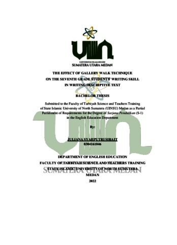 Sirait, Juliana Syahputri (2022) The Effect of Gallery Walk Technique on the Seventh Grade Students’ Writing Skill in Writing Descriptive Text. Skripsi thesis, Universitas Islam Negeri Sumatera Utara.
