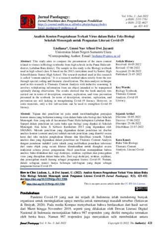 This study aims to compare the presentation of the main content related to viruses in Biology textbooks from high schools in the Panai Hulu sub- district, Labuhan Batu district. The sample in this study is the Biology textbook used in high school class X based on the 2013 curriculum used by Senior High School/Islamic Senior High School. The research method used in this research is called “content analysis.” It is a research method taken strictly from the text through special coding and thematic classification. The data analysis technique used in this research is Thematic Content Analysis with inductive reasoning. It involves withdrawing information from an object intended to be transported optimally during observation. The results showed that the book analysis was carried out in terms of description, structure, replication, and virus prevention presented in the textbook. In terms of description, structure, replication, and prevention are still lacking in strengthening Covid-19 literacy. However, in some materials, only a few sub-sections can be used to strengthen Covid-19 literacy.