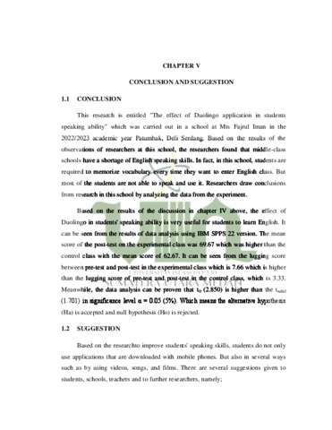 The researcher that has been conducted entitled "The Effect of Duolingo Application in Students Speaking Ability at Mts Fajrul Iman" By using a true experimental quantitative research method, namely by selecting a random sample. The purpose of this study was to obtain tangible evidence about the effect of using the Duolingo application on students' speaking ability. The population taken from this study were students of MTs Fajrul Iman Patumbak Deli Serdang. The sample consisted of 30 people who were divided into an experimental group and a control group. Each group has 15 students where the experimental group will be treated using the Duolingo application while the control group will be treated using different media. The instrument used was a conversational test questionnaire for pre-test and post-test. Data were analyzed using IBM SPSS 22 with t-test formula. Based on the results of statistical calculations with a significant level of 5%, that t0 = 2.850 is higher than tt = 1.701. The results of this study have shown that the Duolingo application has a positive effect on the speaking ability of students at Mts Fajrul iman, Deli Serdang in the 2022/2023 academic year.