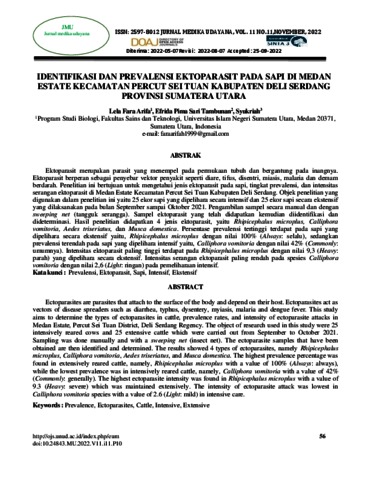 Ectoparasites are parasites that attach to the surface of the body and depend on their host. Ectoparasites act as vectors of disease spreaders such as diarrhea, typhus, dysentery, myiasis, malaria and dengue fever. This study aims to determine the types of ectoparasites in cattle, prevalence rates, and intensity of ectoparasite attacks in Medan Estate, Percut Sei Tuan District, Deli Serdang Regency. The object of research used in this study were 25 intensively reared cows and 25 extensive cattle which were carried out from September to October 2021. Sampling was done manually and with a sweeping net (insect net). The ectoparasite samples that have been obtained are then identified and determined. The results showed 4 types of ectoparasites, namely Rhipicephalus microplus, Calliphora vomitoria, Aedes triseriatus, and Musca domestica. The highest prevalence percentage was found in extensively reared cattle, namely, Rhipicephalus microplus with a value of 100% (Always: always), while the lowest prevalence was in intensively reared cattle, namely, Calliphora vomitoria with a value of 42% (Commonly: generally). The highest ectoparasite intensity was found in Rhipicephalus microplus with a value of 9.3 (Heavy: severe) which was maintained extensively. The intensity of ectoparasite attack was lowest in Calliphora vomitoria species with a value of 2.6 (Light: mild) in intensive care.