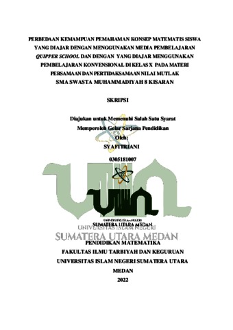 Syafitriani, Syafitriani (2022) Perbedaan Kemampuan Pemahaman Konsep Matematis Siswa Yang Diajar Dengan Menggunakan Media Pembelajaran Quipper School Dan Dengan Yang Menggunakan Pembelajaran Konvensional Di Kelas X Pada Materi Persamaan Dan Pertidaksamaan Nilai Mutlak SMA Swasta Muhammadiyah 8 Kisaran. Skripsi thesis, Universitas Islam Negeri Sumatera Utara.