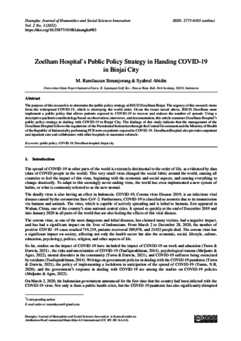 Simanjorang, M. Ramfauzan and Abidin, Syahrul (2022) Zoelham Hospital’s Public Policy Strategy In Handing COVID-19 In Binjai City. Daengku: Journal of Humanities and Social Sciences Innovation, 2 (3). ISSN 2775-6165