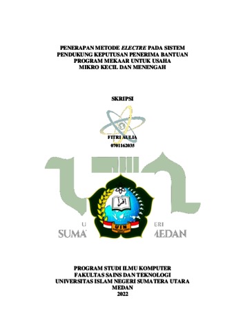 Aulia, Fitri (2022) Penerapan Metode Electre pada Sistem Pendukung Keputusan Penerima Bantuan Program Mekaar untuk Usaha Mikro Kecil dan Menengah. Skripsi thesis, Universitas Islam Negeri Sumatera Utara.