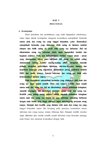 Penelitian ini berjudul Komunikasi Antarpribadi Bermedia Antara Anak dan Orang Tua Yang Tinggal Berjauhan. Tujuan Penelitian ini adalah iuntuk imengetauhi ibagaimana iproses ikomunikasi iantarpribadi ibermedia iantara ianak idan iorang itua iyang itinggal iberjauhan idalam imenghadapi ikonflik idi idesa iPanigoran ikecamatan iAek iKuo iKabupaten iLabuhan iBatu iUtara iSumatera iUtara. Teori yang digunakan adalah Komunikasi, komunikasi antarpribadi, komunikasi keluarga ,komunikasi antarpribadi bermedia, dan konflfik. Objek yang diteliti adalah Mahasiswa yang bertempat tinggal di desa Panigoran kecamatan Aek kuo. Metode yang digunakan dalam penelitian adalah metode kualitatif deskriptif yang memiliki maksud untuk mengetahui proses komunikasi antarpribadi bermedia antara anak dan orang tua yang tinggal berjauhan, untuk mengetahui penyebab konflik yang terjadi didalamnya dan cara peyelesaiannya. Teknik pengumpulan data pada penelitian ini ialah dengan mengguanakn metode obervasi, wawancara, dan dokumentasi. Hasil dari peneltian ini menunjukkan bahwasannya konflik sering terjadi karena perbedaan keinginan anatara anak dan orang tua yang disebabkan olleh berbagai hal. Dampak yang paling sering terjadi ialah putusnya hubungan komunikasi anatara anak dan orang tua selama beberapa hari. Dalam menghadapi konfilk informan biasa meminta maaf kepada orang tua ataupun informan dan orang tua membicarakan hal diluar konflik atau membicarakan hal yang menyenangkan sehingga konflik yang terjadi hilang dengan sendirinya