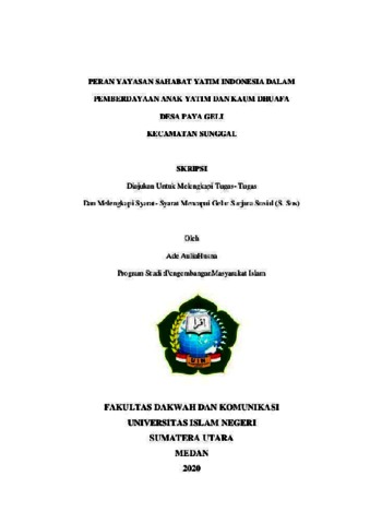 Husna, Ade Aulia (2020) Peran Yayasan Sahabat Yatim Indonesia dalam Pemberdayaan anak yatim dan dhuafa desa Paya Geli Kecamatan Sunggal. Skripsi thesis, Universitas Islam Negeri Sumatera Utara.