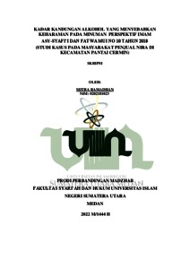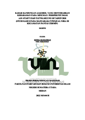 Ramadhan, Mitra (2022) Kadar Kandungan Alkohol yang Menyebabkan Keharaman pada minum Perspektif Imam Asy-Syafi'i dan Fatwa MUI No. 10 Tahun 2018 (Studi Kasus pada Masyarakat Penjual Nira di Kecamatan Pantai Cermin). Skripsi thesis, Universitas Islam Negeri Sumatera Utara.