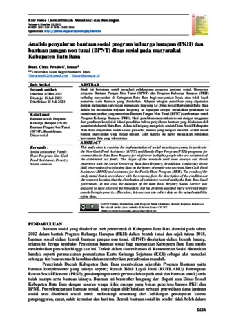 Pratiwi, Dara Citra and Imsar, Imsar (2022) Analisis Penyaluran Bantuan Sosial Program Keluarga Harapan (PKH) Dan Bantuan Pangan Non Tunai (BPNT) Dinas Sosial Pada Masyarakat Kabupaten Batu Bara. Fair Value : Jurnal Ilmiah Akuntansi dan Keuangan, 4 (12). ISSN P-ISSN: 2622-2191 E-ISSN : 2622-2205